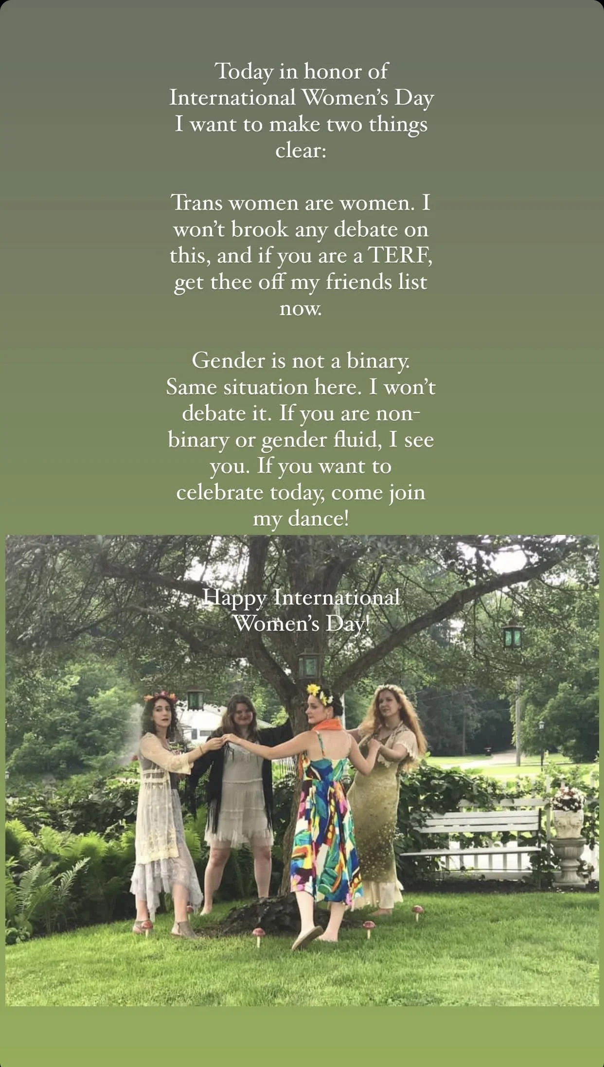 So although it may have seemed like a small thing (and it really was), it was a rare sign of my personal politics on social media that day when I added one more story to Instagram, simply stating that transgender women are women, and gender is not a binary. If anyone unfollowed me or took offense at the statement, they did so quietly and I was oblivious to the fact.