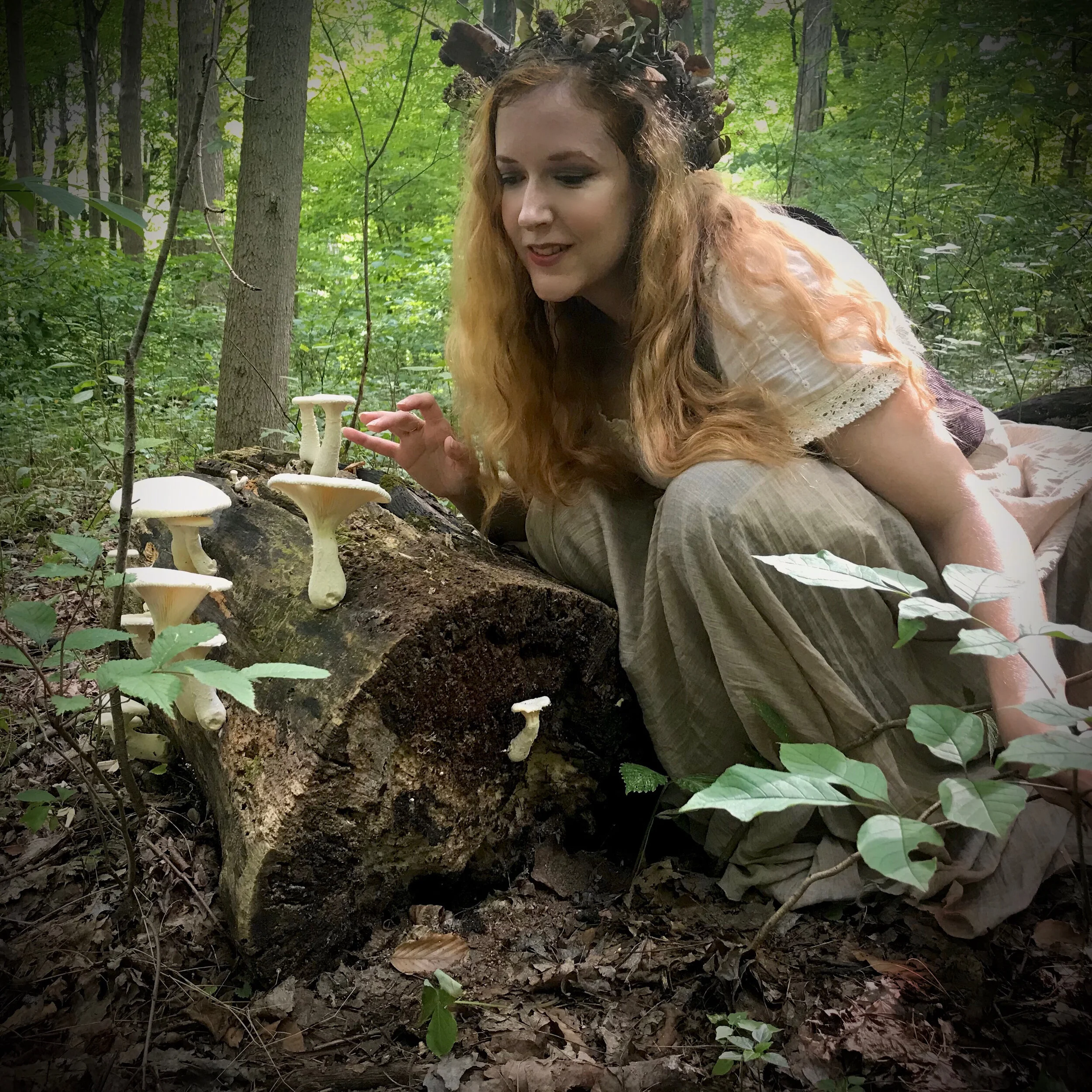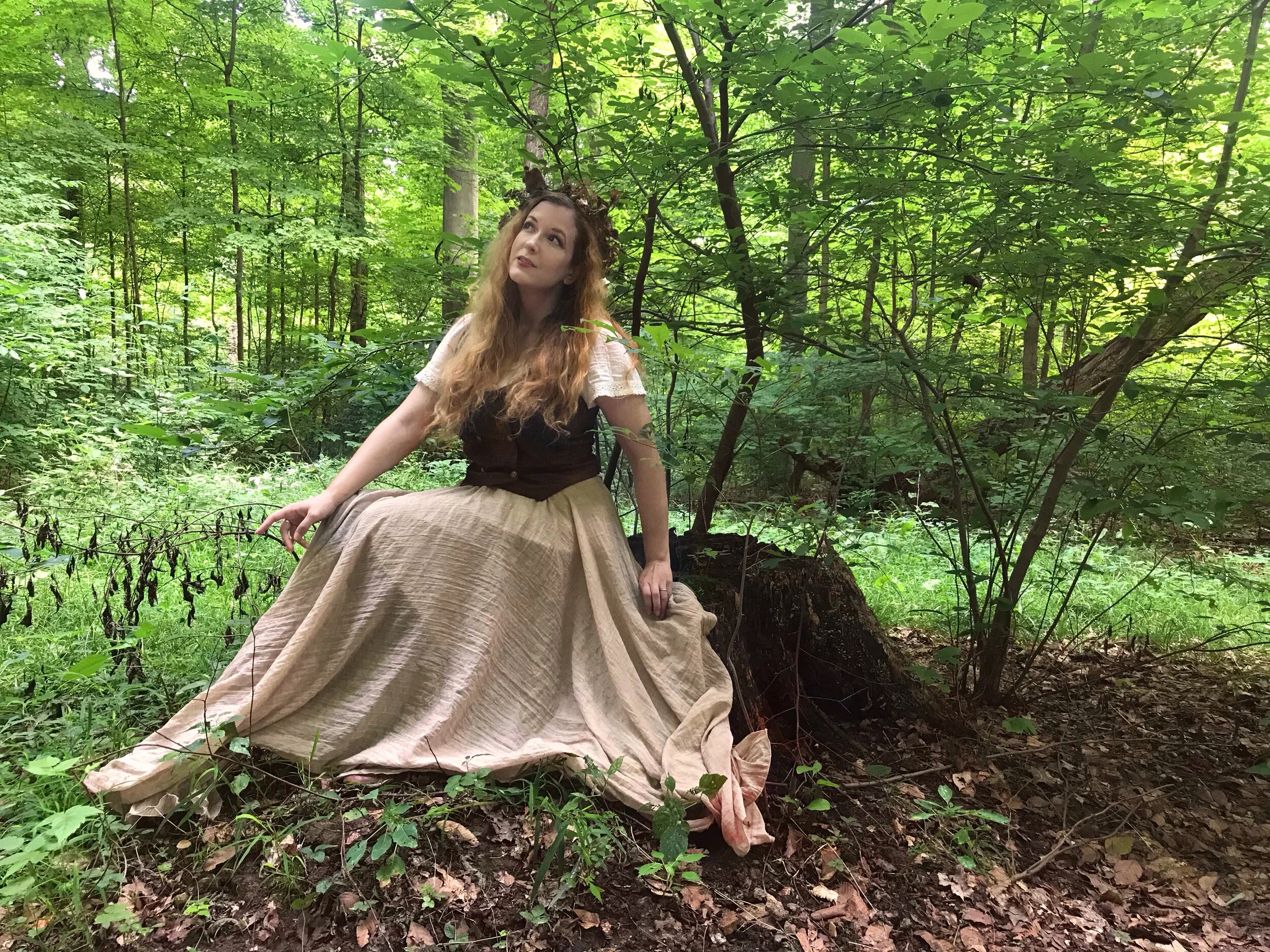 I started out my morning planning to visit the Denison Bio Reserve, but instinct suddenly told me I should return to Dawes East, the forest trail I only recently found out about and still haven’t explored fully. Mind you, there are still many paths at Denison I still haven’t fully explored, but I’ve learned to trust my gut when it comes to where I go exploring on my days off. I had chosen my outfit in my sleep (I’ve had insomnia lately, and in the half-awake-half-asleep moments in the middle of the night I sometimes ponder random things), and when I put it on, it just felt good and right. I wore my favorite boots, which my friend Brittany Warman dubbed my “mushroom hunting boots” the day I bought them at a thrift store (and they have indeed brought me luck in finding fungi), black leggings, (protection against mosquitos, ticks, chiggers, etc) and my long and flowing khaki linen skirt (which I hiked up while I walked…another benefit of the leggings). I paired these with a floaty short sleeved ivory blouse, my Celtic Fusion Designs double breasted vest with a tree of life embroidered on the back (sadly my hair almost always covers this stunning detail), and a flower crown I made at the end of last winter with dried plant material in my garden. I love this particular flower crown because it’s all in shades of brown and green, and doesn’t steal the limelight from my surroundings in forest photos.
