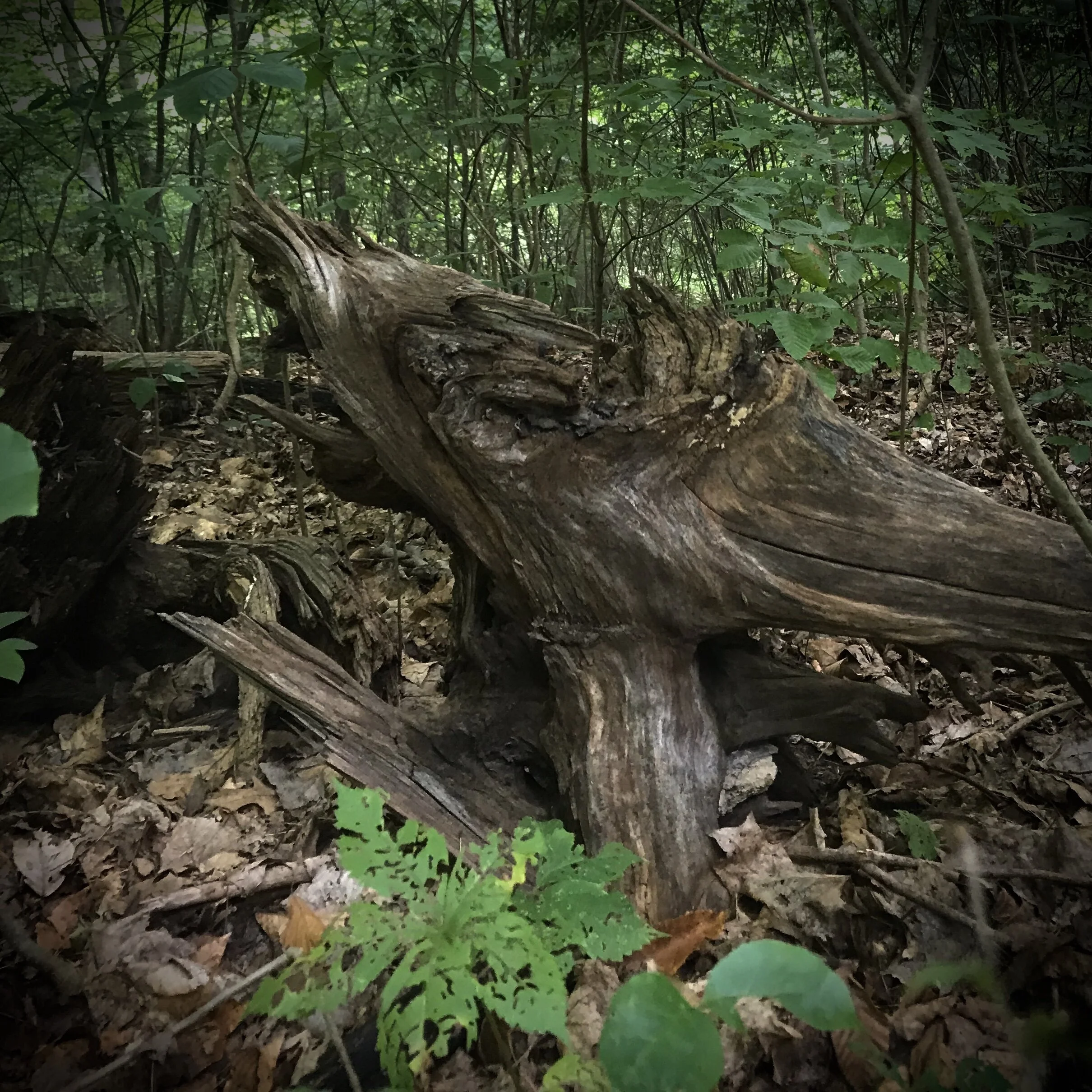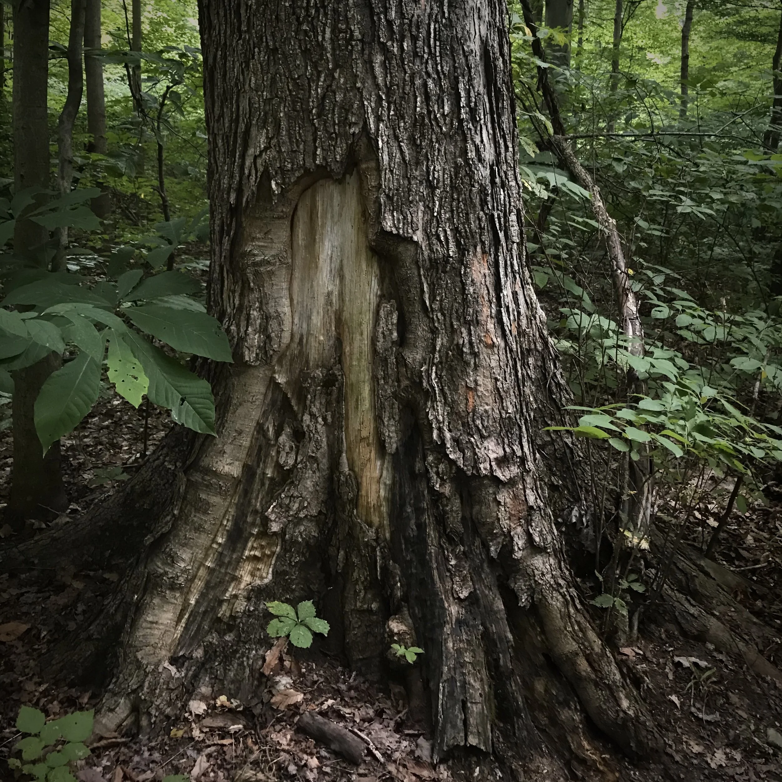Dawes East (if you aren’t on my newsletter list and were privy to a video from my first day hiking there) has a Hopewell Mound. It’s a sacred site built long long ago (possibly so long ago that the date ends in “B.C.”), and as you wander the forests nearby, you can feel that magic and see why the ancient people wanted to pay homage to the energy. As I parked my car and made sure I had everything with me that I needed, I had a good feeling about how my explorations would go. This feeling was very quickly confirmed when I walked past the bog and on the other side, I immediately saw a tree that boasted the largest shelf mushroom I’ve ever found in person. Peering at it at different angles, crouched on the ground, was like seeing a miniature world. I hadn’t even made my way to Dawes East yet, and I was already finding magical natural marvels!