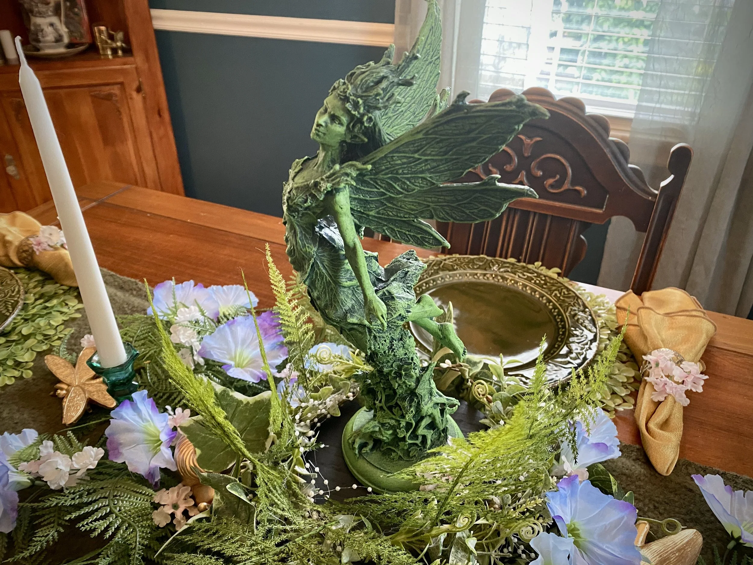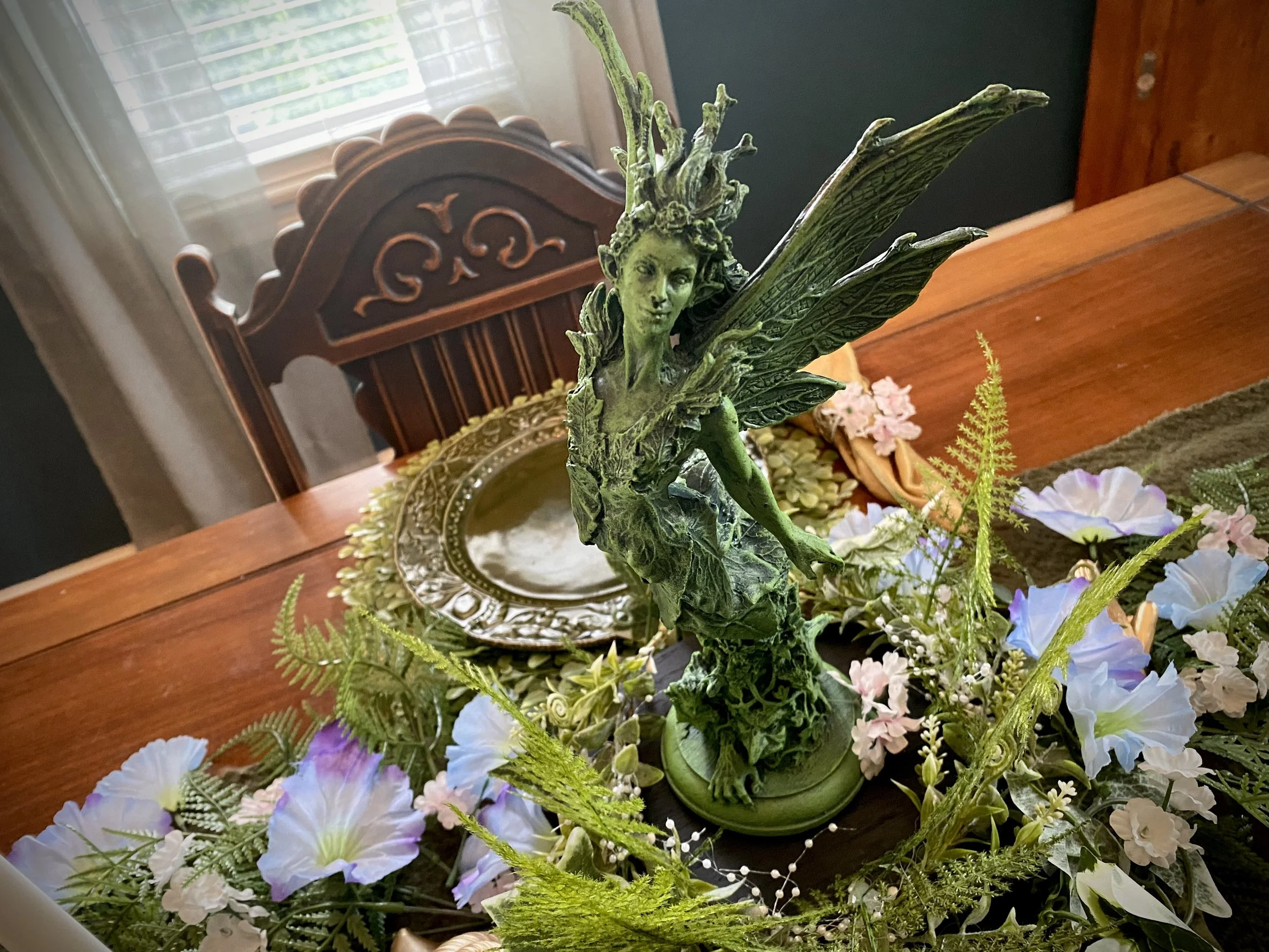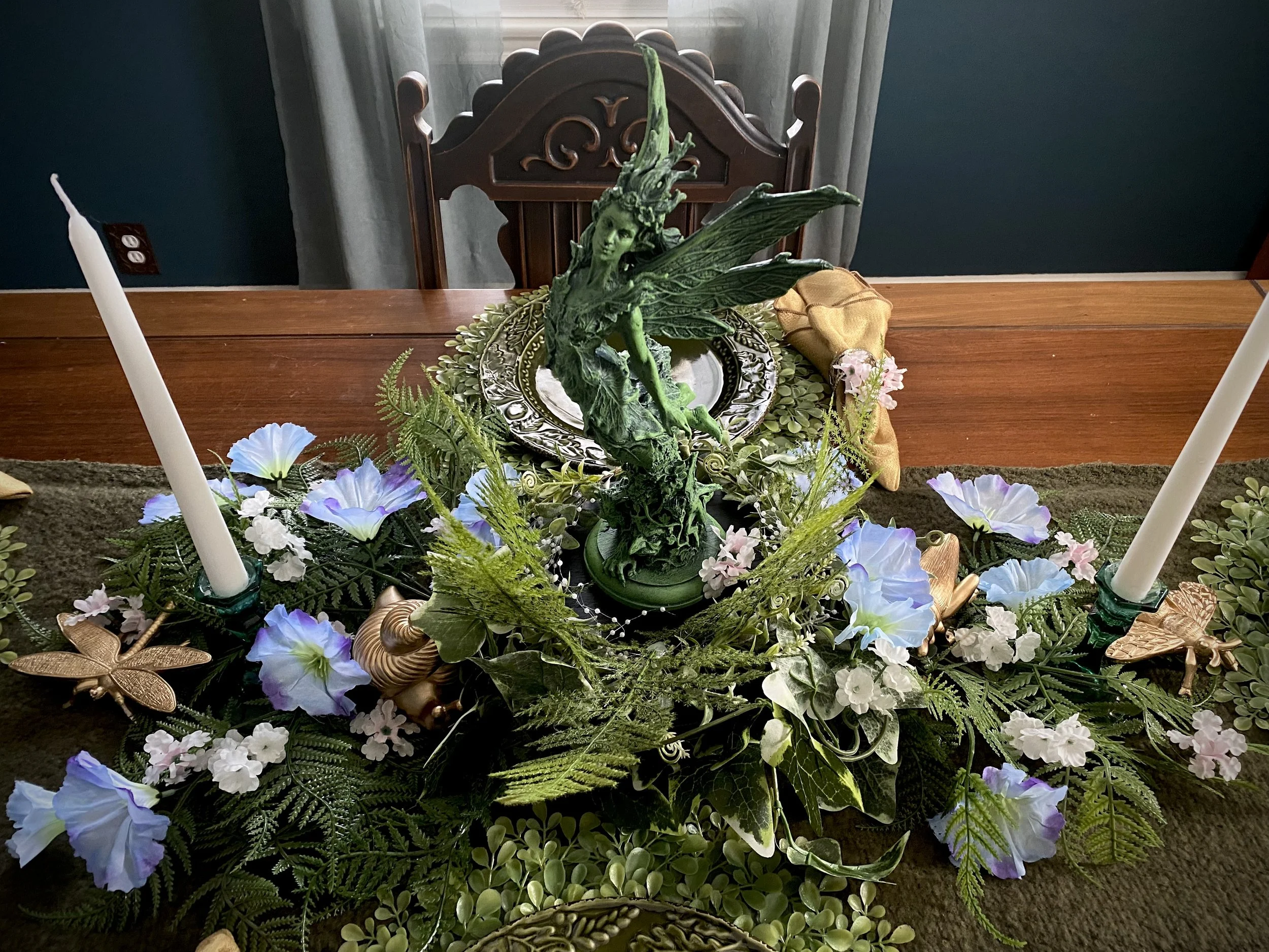 The centerpiece of the table is this sculpture of Titania by Dellamorteco. I deliberated adding some gold dry brushing to it and still may, just as I also want to add some patina and green to the gold insects. But for now, I like it as is too.