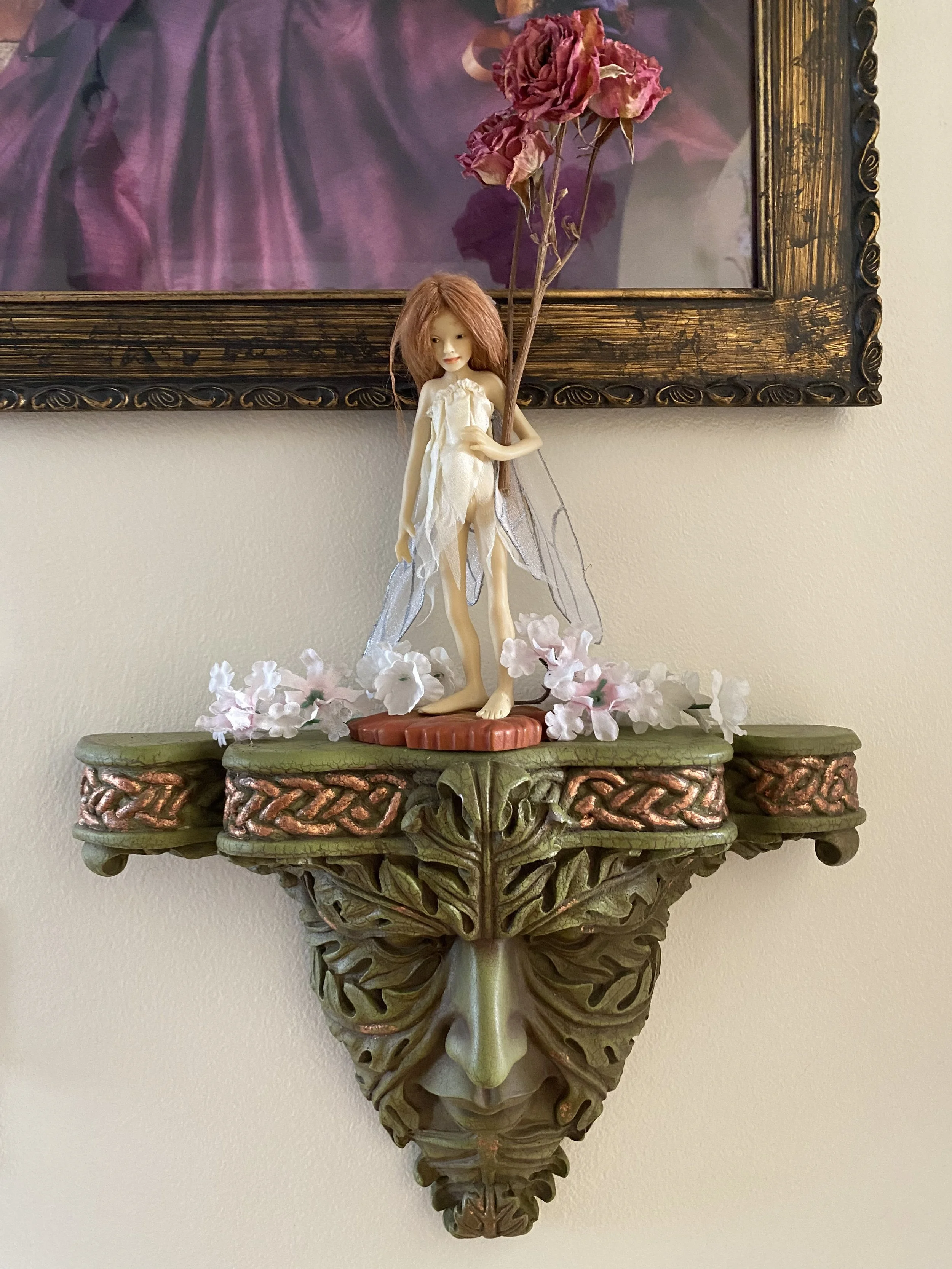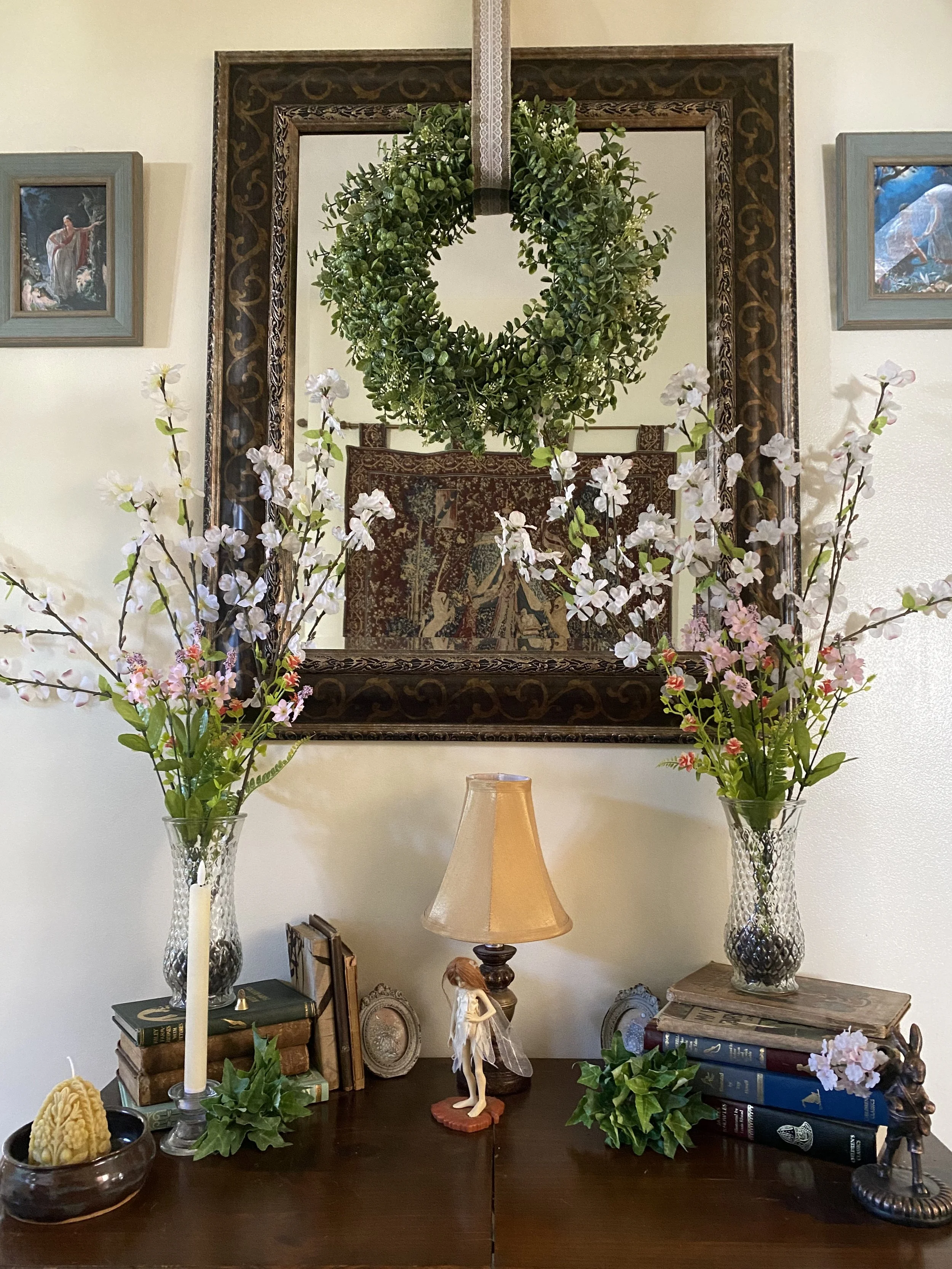 The hall table is still a work in progress. I’m considering getting this incredible paper art for the table center, since I’ve now moved the little Wendy Froud faerie since I took this photo. But I’m open to other suggestions to make this area more Midsummer faerie bower-ish!