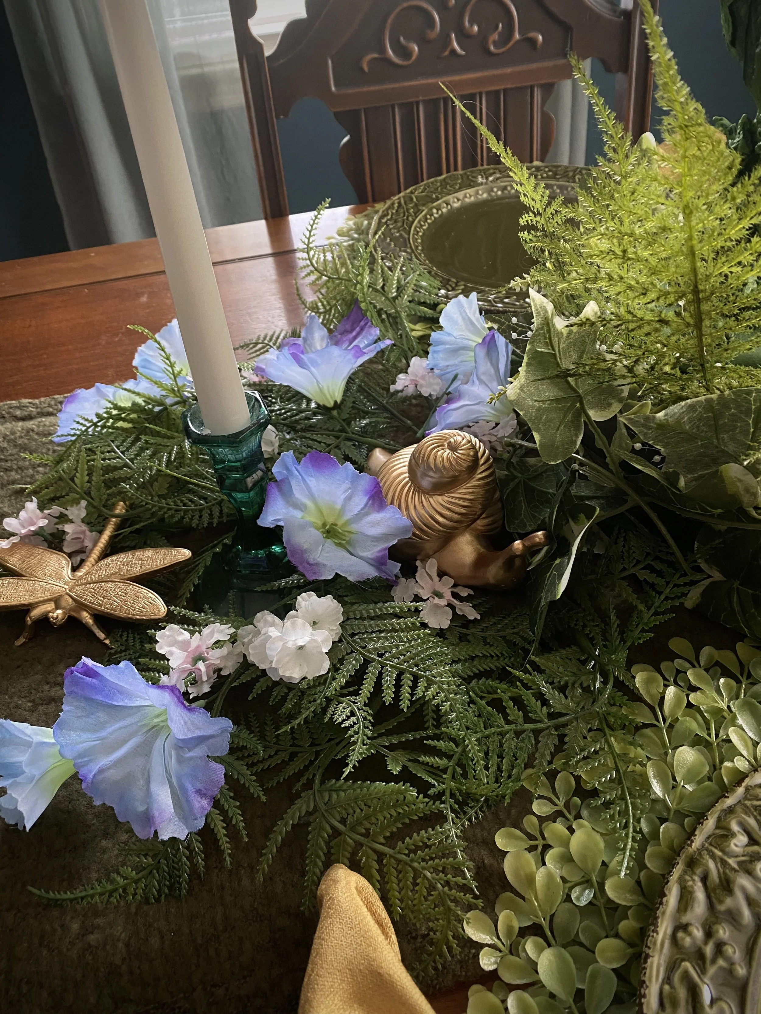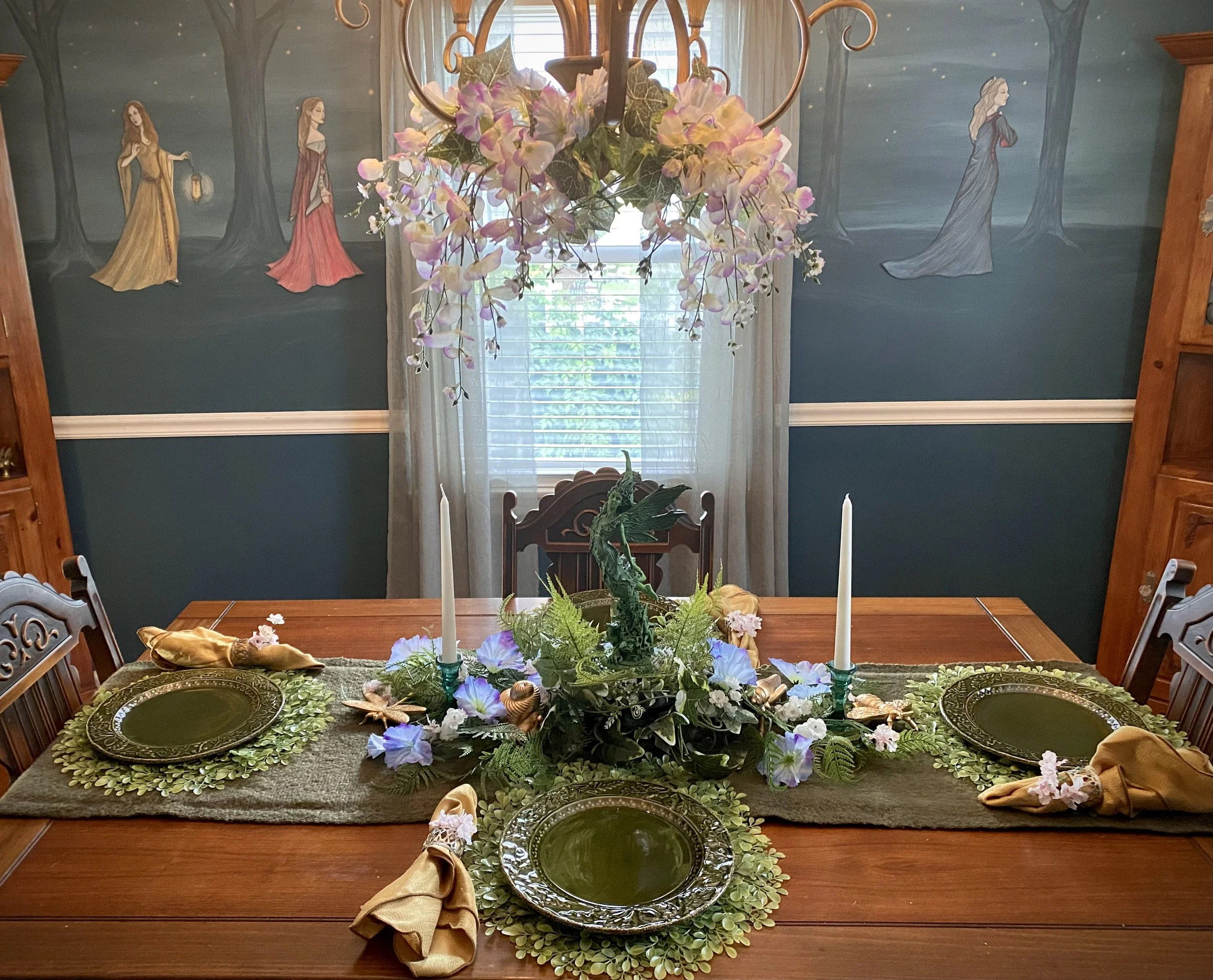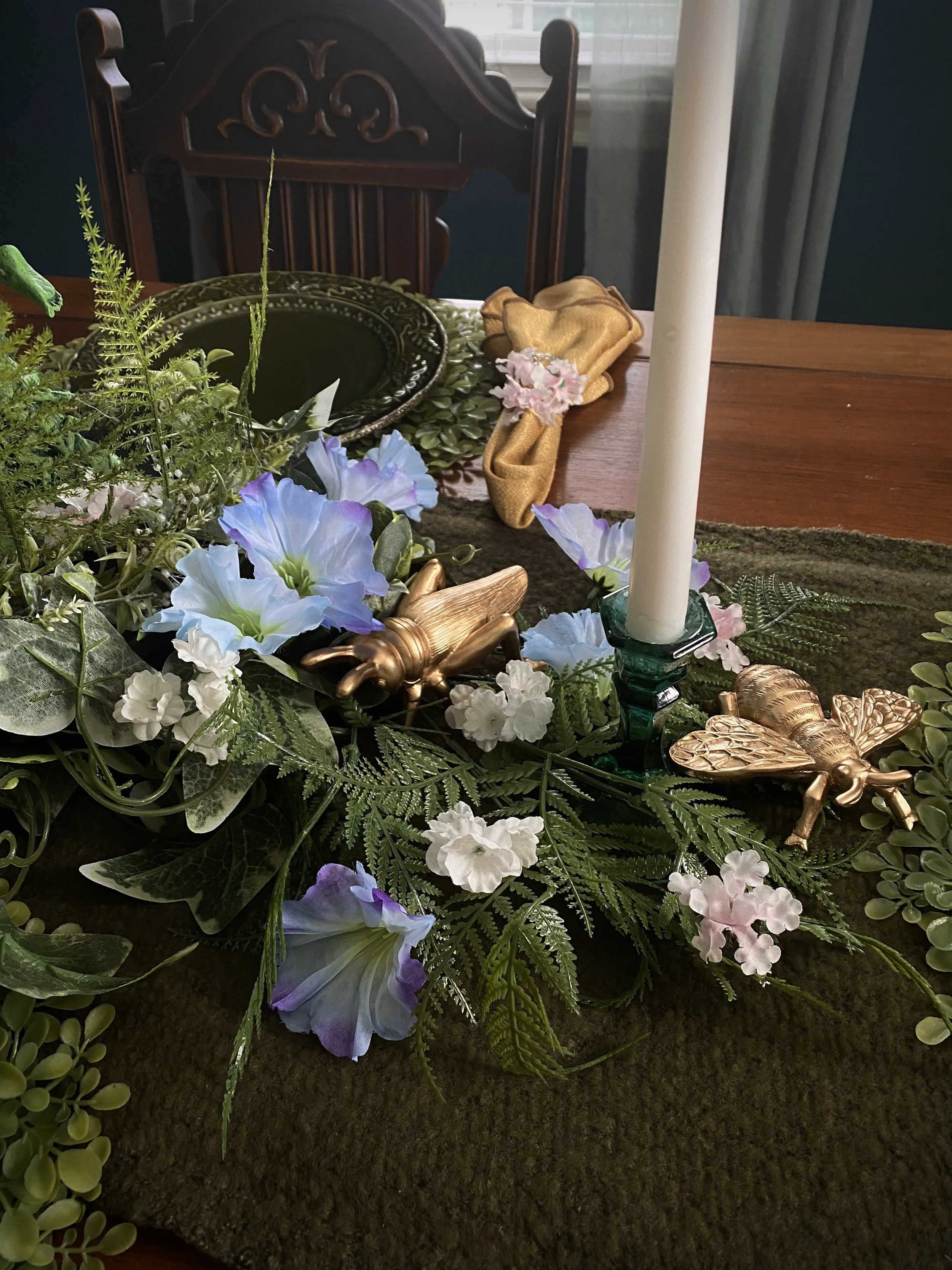 The main event for the theme is my dining room table. I had a midsummer themed party a few years ago, and wanted to try to get the same feel from that decor across in a way I could keep up all season. (Real moss and dangling yarn do not mix well with two cats.) So the moss became a nubby moss green scarf used as a table runner, the yarn vines turned into wisteria, and so on.