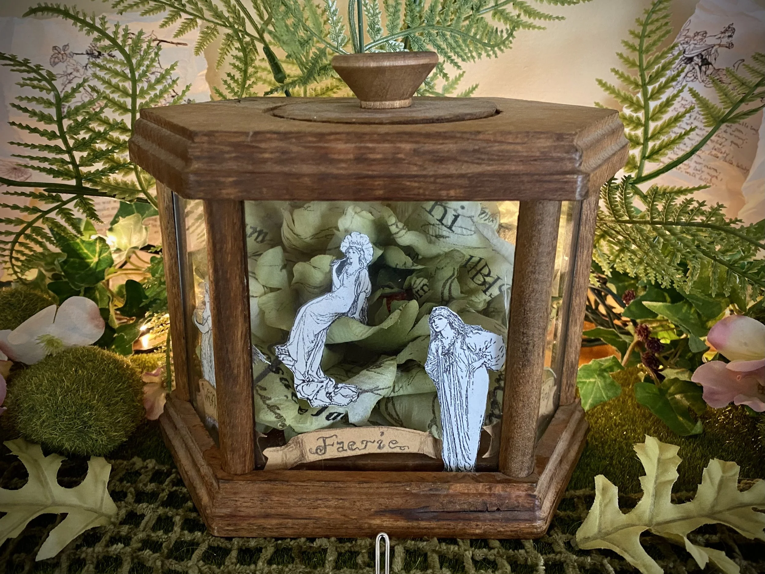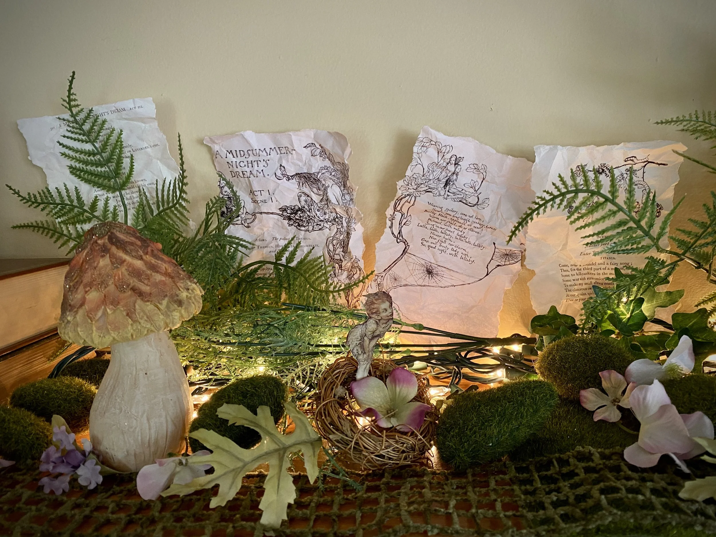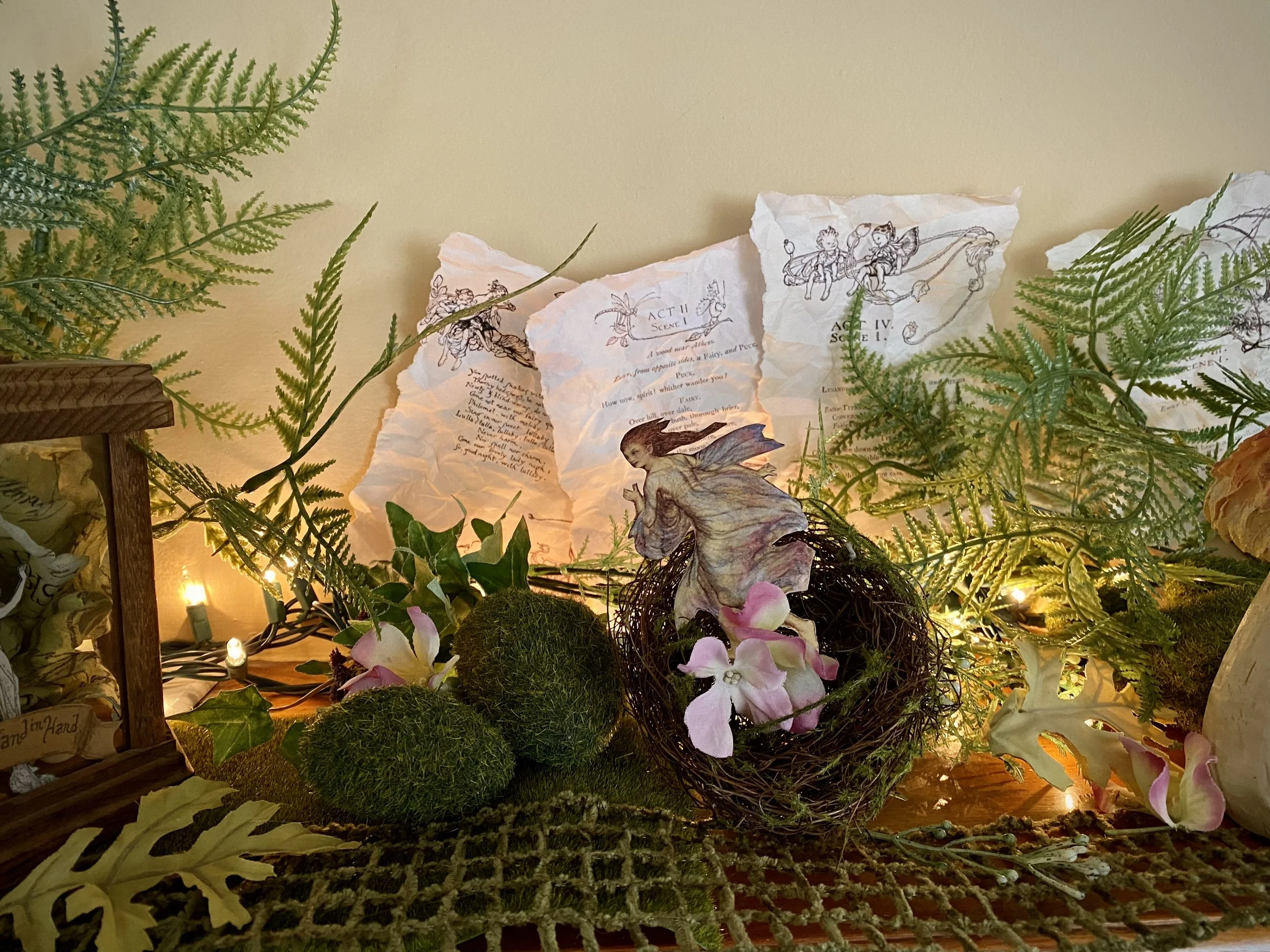 In the very back, I added more of the ferns from Dollar Tree, and printed out pages of the Arthur Rackham illustrated A Midsummer Night’s Dream, carefully tore the edges and crumpled and smoothed them to age them, and tucked them in among the faux ferns.