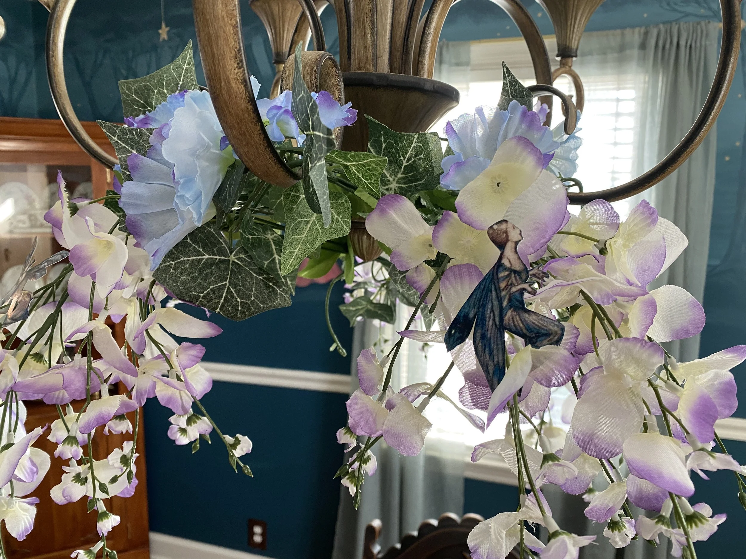 Nestled into the wisteria in the chandelier are a few Arthur Rackham faeries. Do you see the one in each photo below?