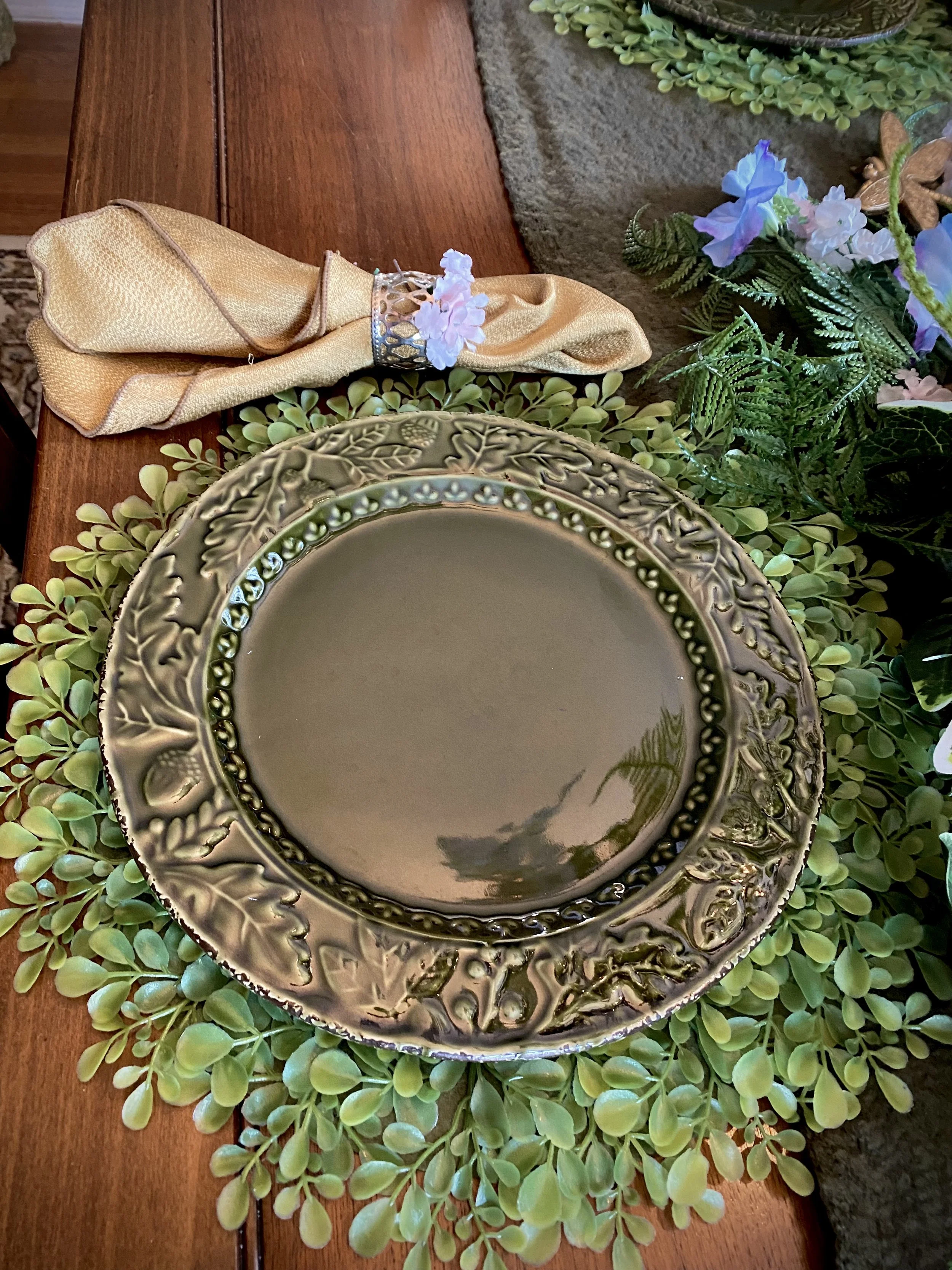 The table is set with green oak leaf and acorn plates, with leafy placemats tucked underneath.