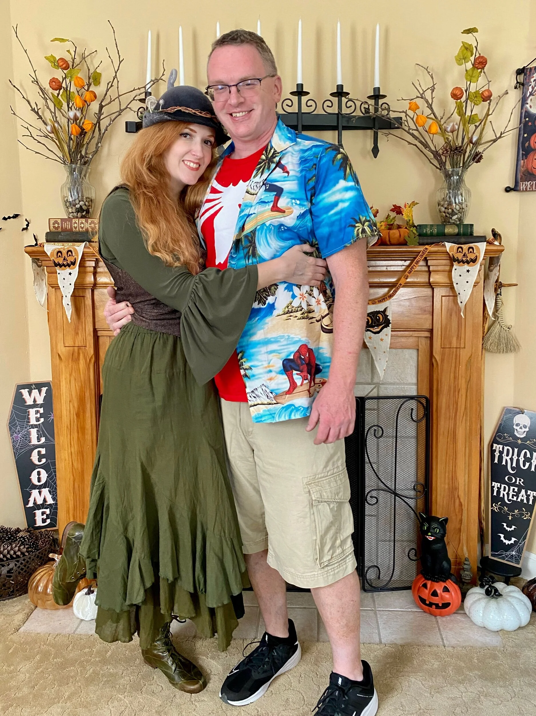 This photo was taken at our local arboretum. At the time, I didn’t yet have a tripod and remote to take my own photos, so I asked Tom to take them for me. And a lovely stranger came along and asked if we wanted him to take a photo of the two of us together. What I remember about this moment is how I had to forcibly shift my way of thinking from posing dreamily for my own solo shots to taking this photo with Tom, and how the thought hadn’t even occurred to me until then to get a photo of the two of us together. And yes, there we are. He’s in his Disney hoodie and jeans, and I’m in a velvet gown and silver filigree elf ear tips. And we are both perfectly ourselves.