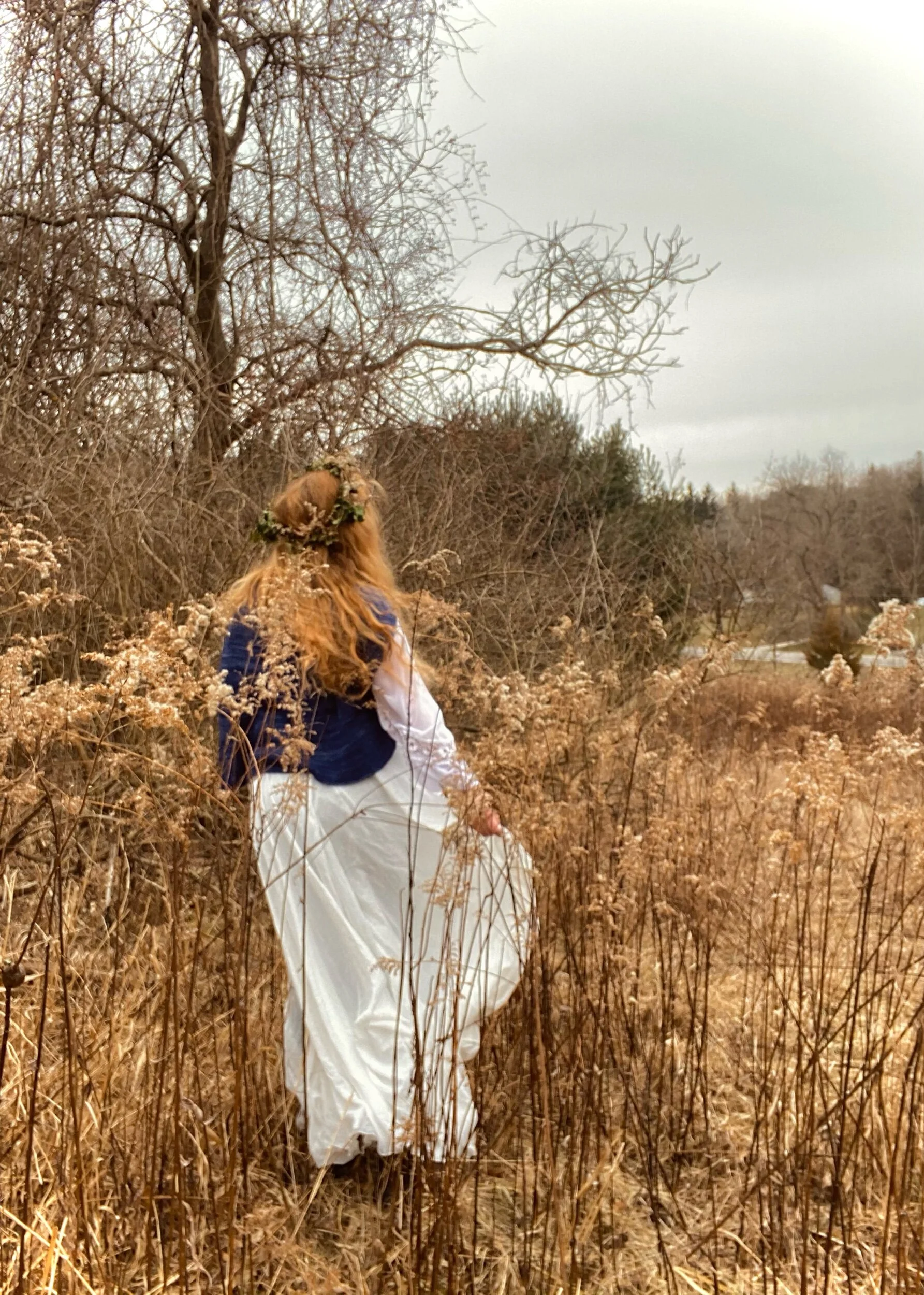 /She stands on a rolling hillside, wildflowers spilling in every direction. The mountains in the distance are soft white merengue peaks as she runs away from us, the viewer, in slow motion. Her long hair waves in beckoning ripples as she lifts her billowing skirts and leaps headfirst toward some magical destination only she knows.