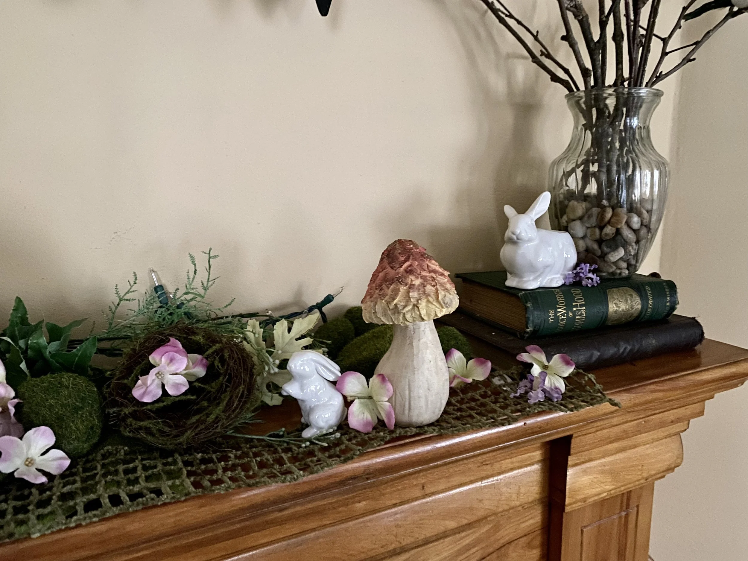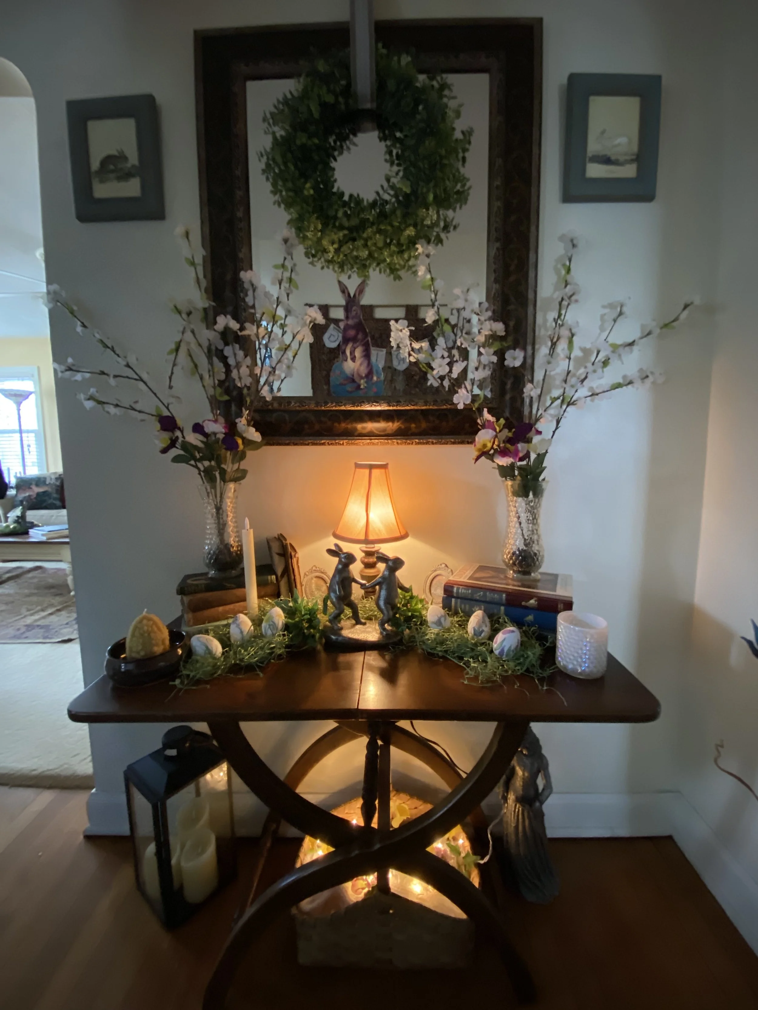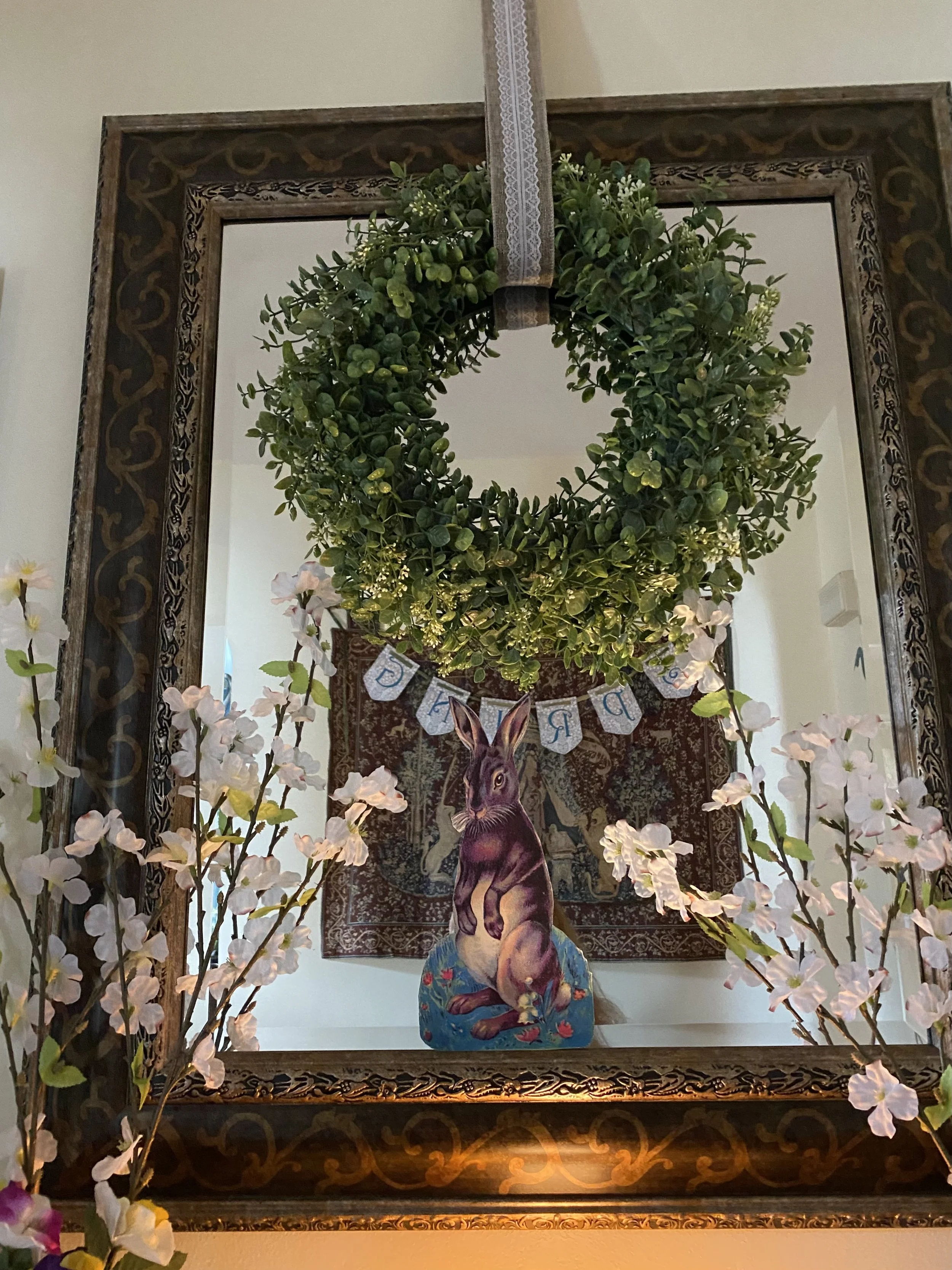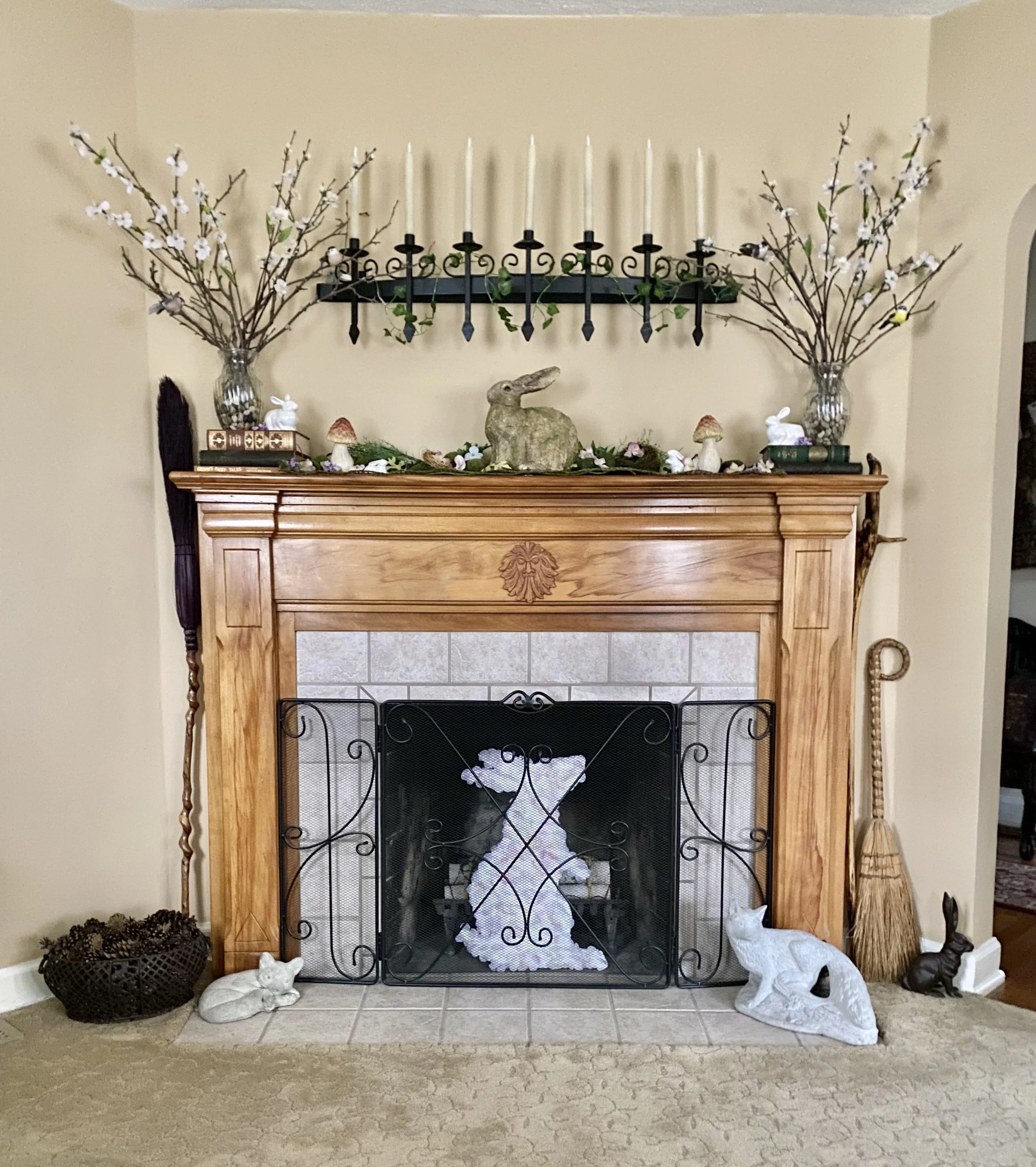 My favorite part of the house this year is actually the entry table. I really love how that area looks. But I’m also proud of the giant floral rabbit I created for my fireplace area, using foam board and lots of glued on flowers from Dollar Tree. Last year I filled the fireplace with faux flowers and it just wasn’t doing it for me. With everything going on on the mantel, it was too busy. I love how the giant rabbit/hare looks instead!