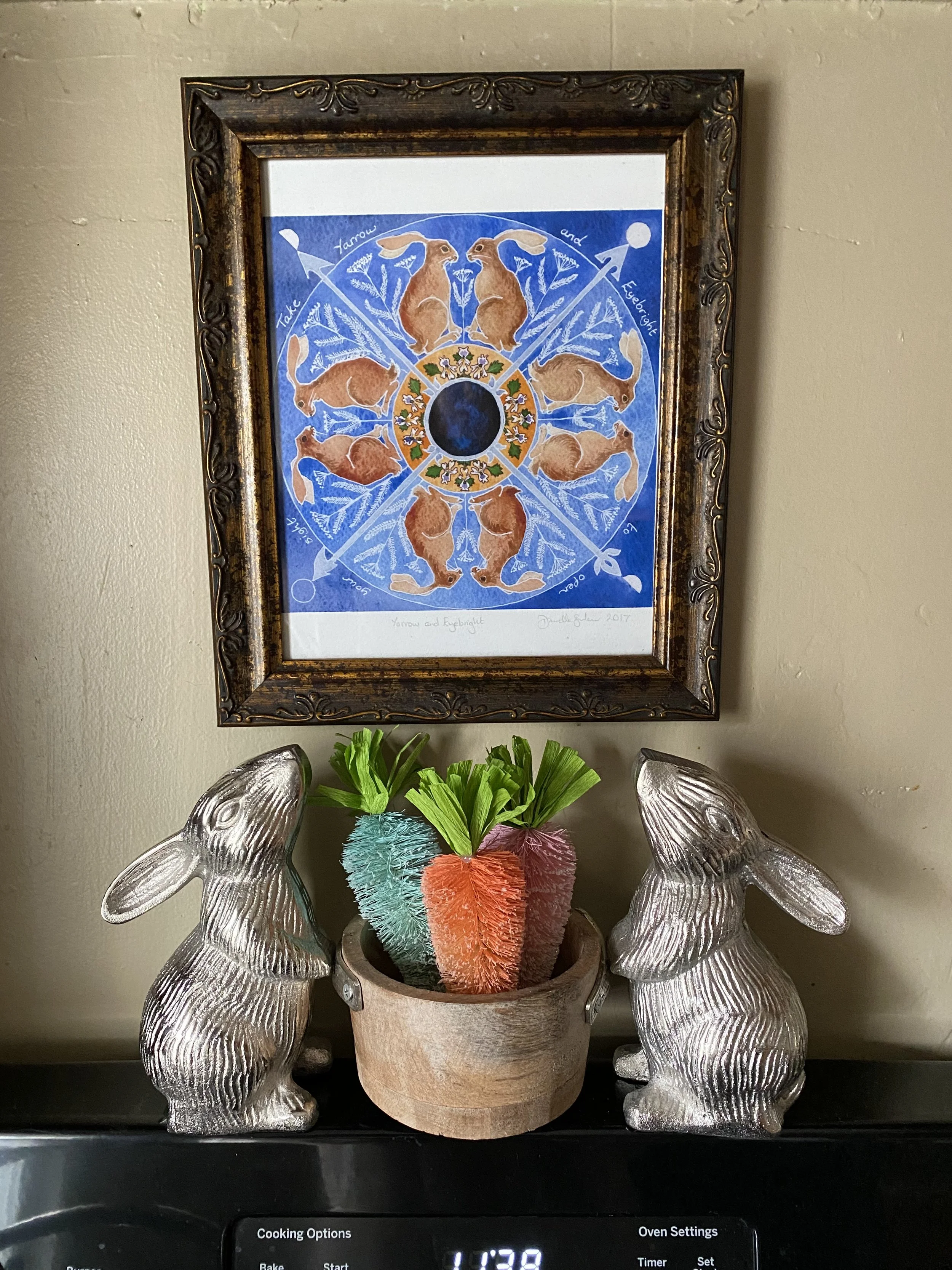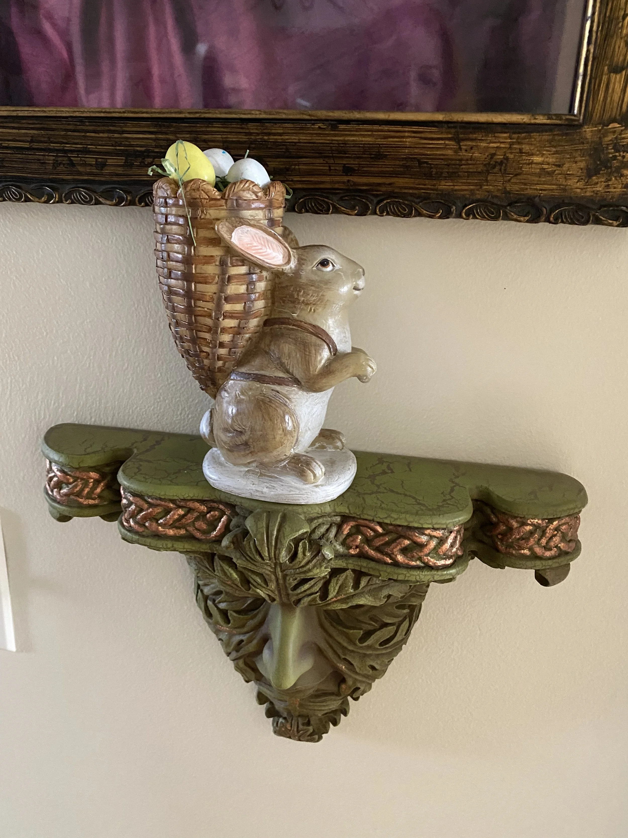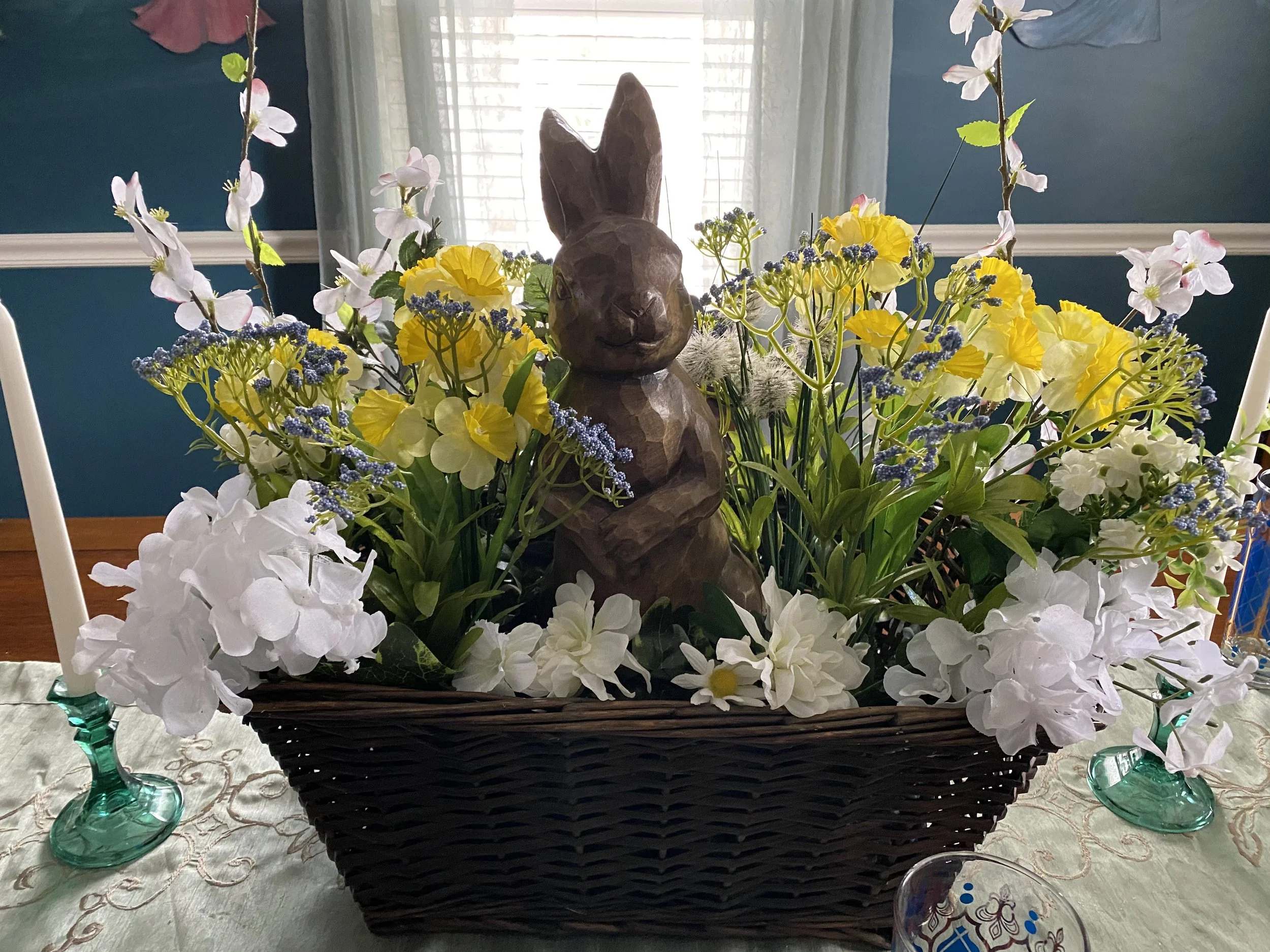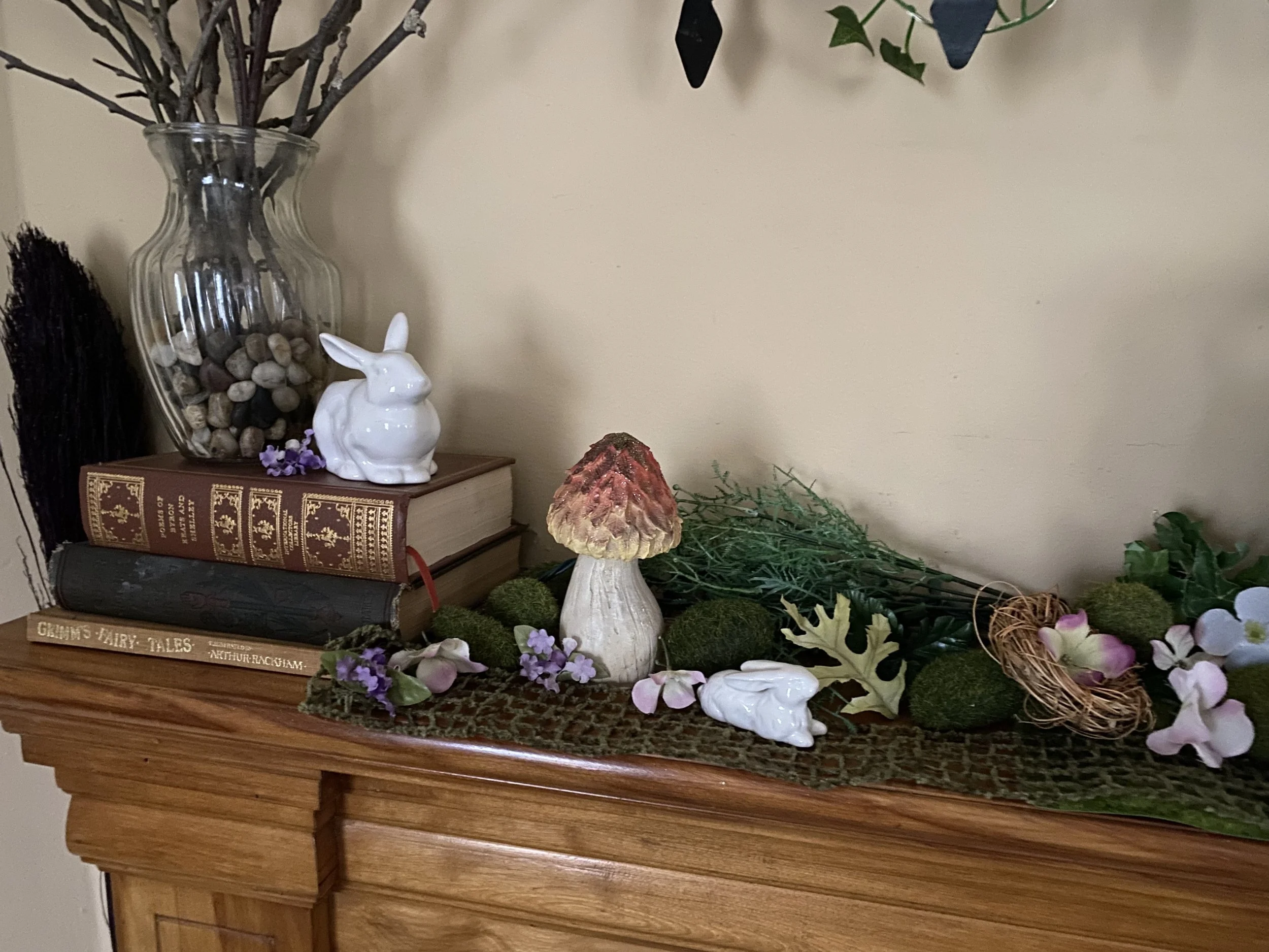 My favorite part of the house this year is actually the entry table. I really love how that area looks. But I’m also proud of the giant floral rabbit I created for my fireplace area, using foam board and lots of glued on flowers from Dollar Tree. Last year I filled the fireplace with faux flowers and it just wasn’t doing it for me. With everything going on on the mantel, it was too busy. I love how the giant rabbit/hare looks instead!