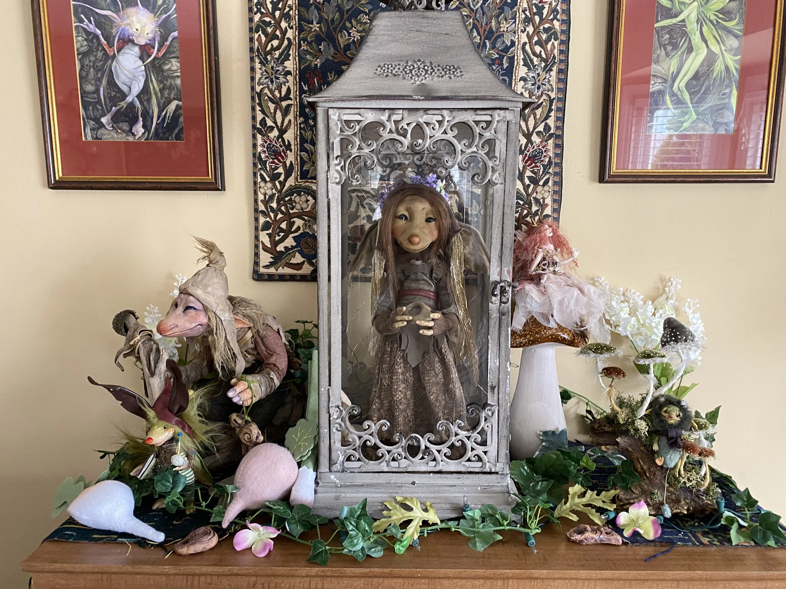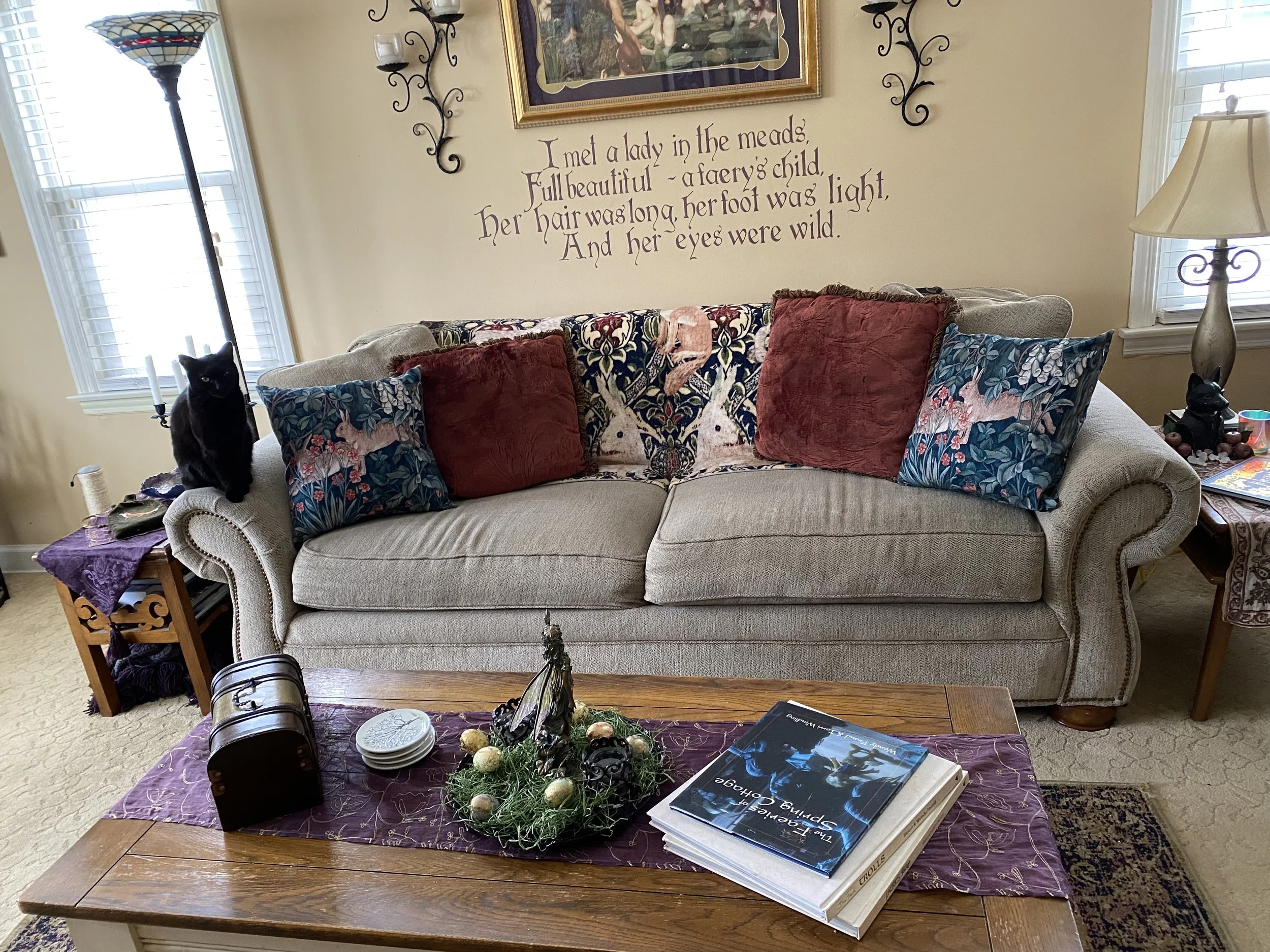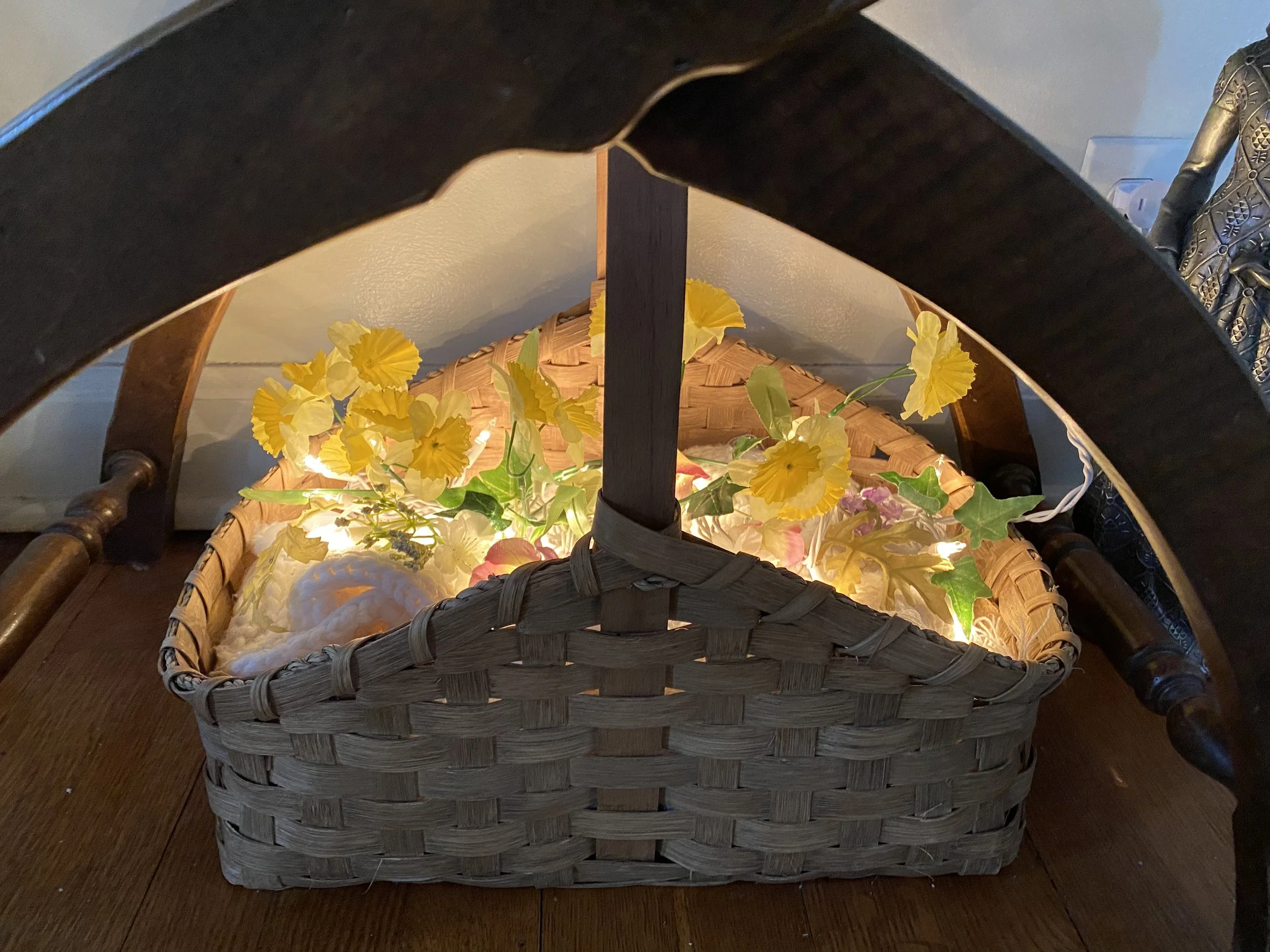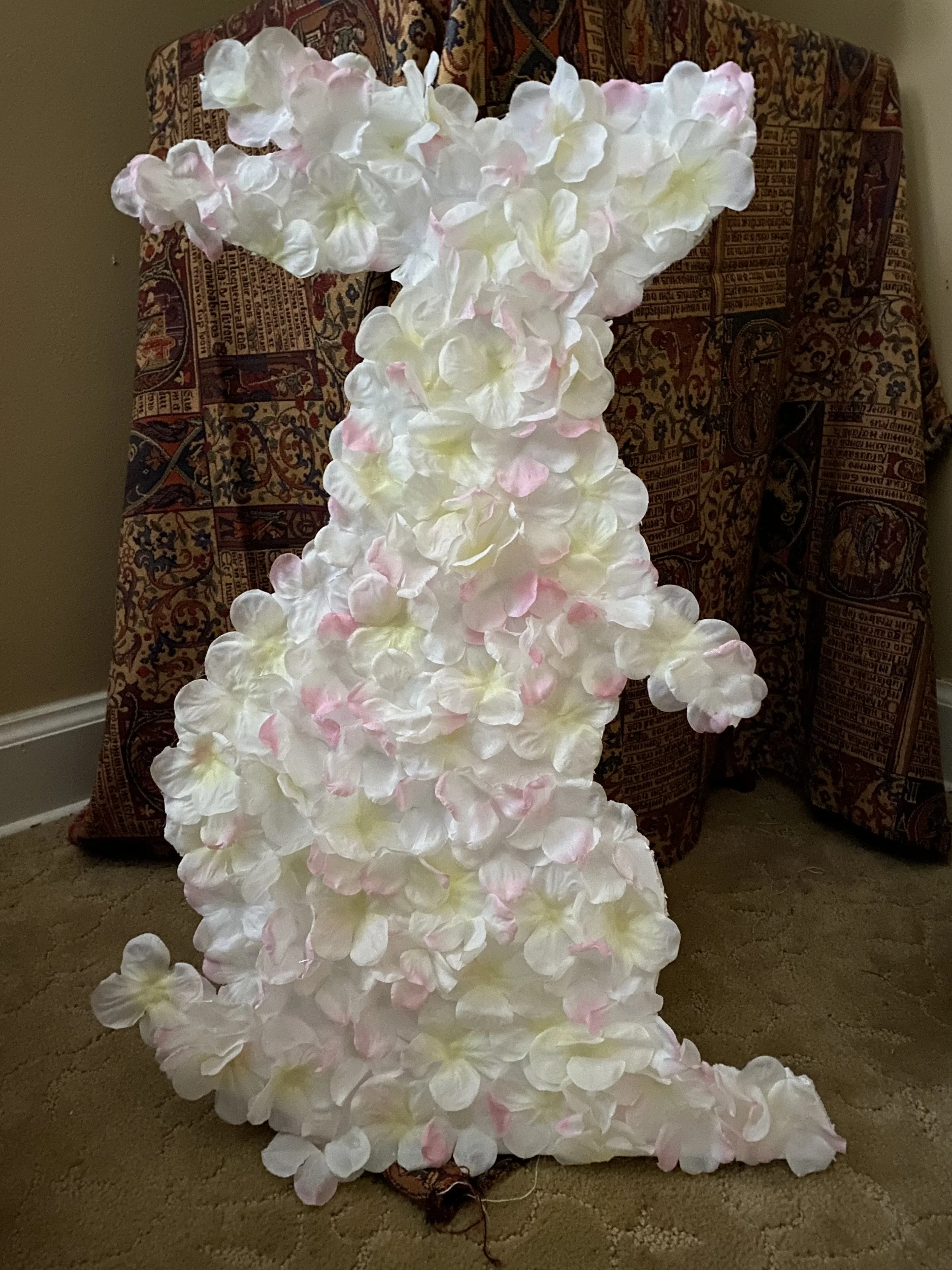 My favorite part of the house this year is actually the entry table. I really love how that area looks. But I’m also proud of the giant floral rabbit I created for my fireplace area, using foam board and lots of glued on flowers from Dollar Tree. Last year I filled the fireplace with faux flowers and it just wasn’t doing it for me. With everything going on on the mantel, it was too busy. I love how the giant rabbit/hare looks instead!