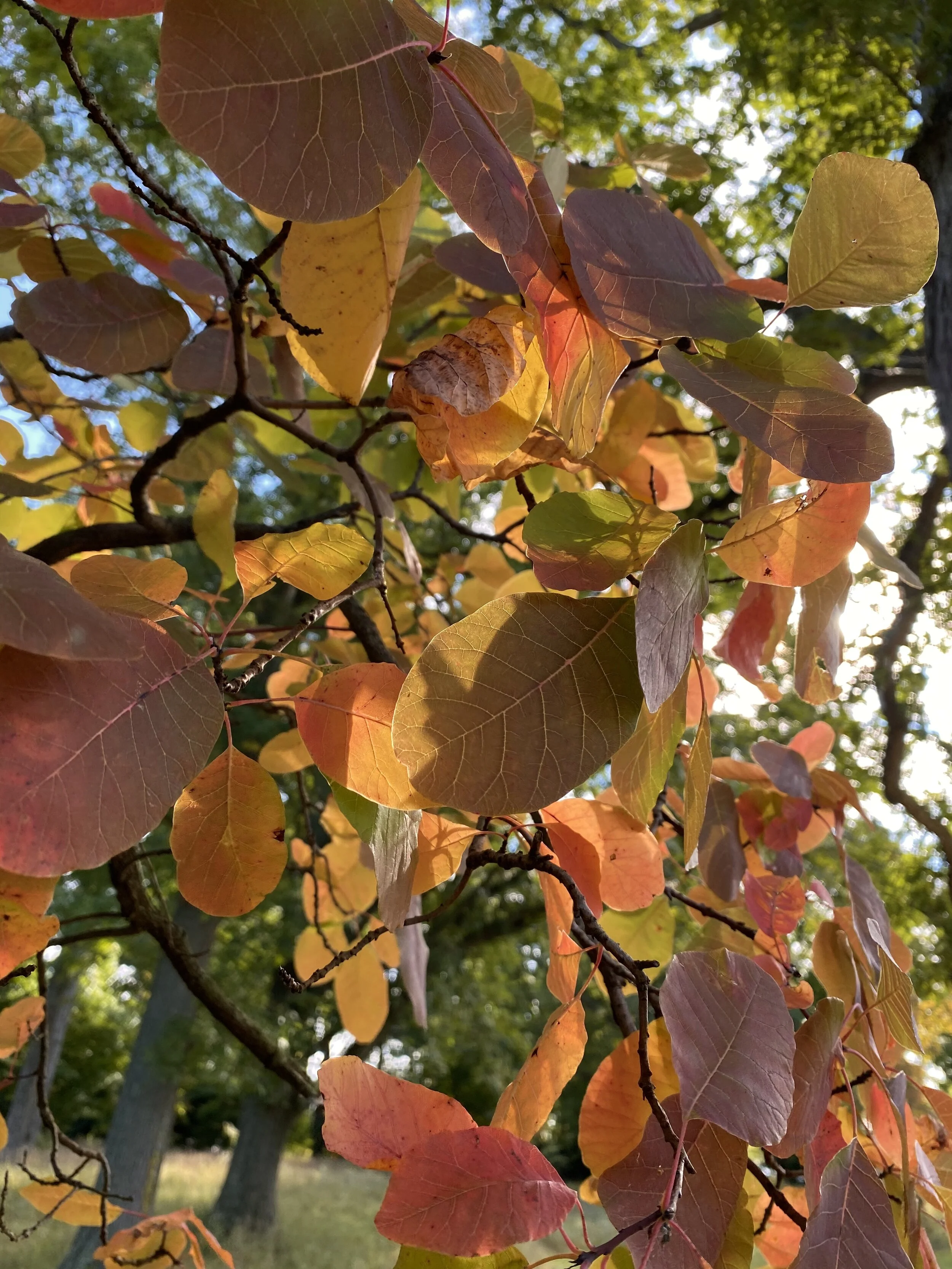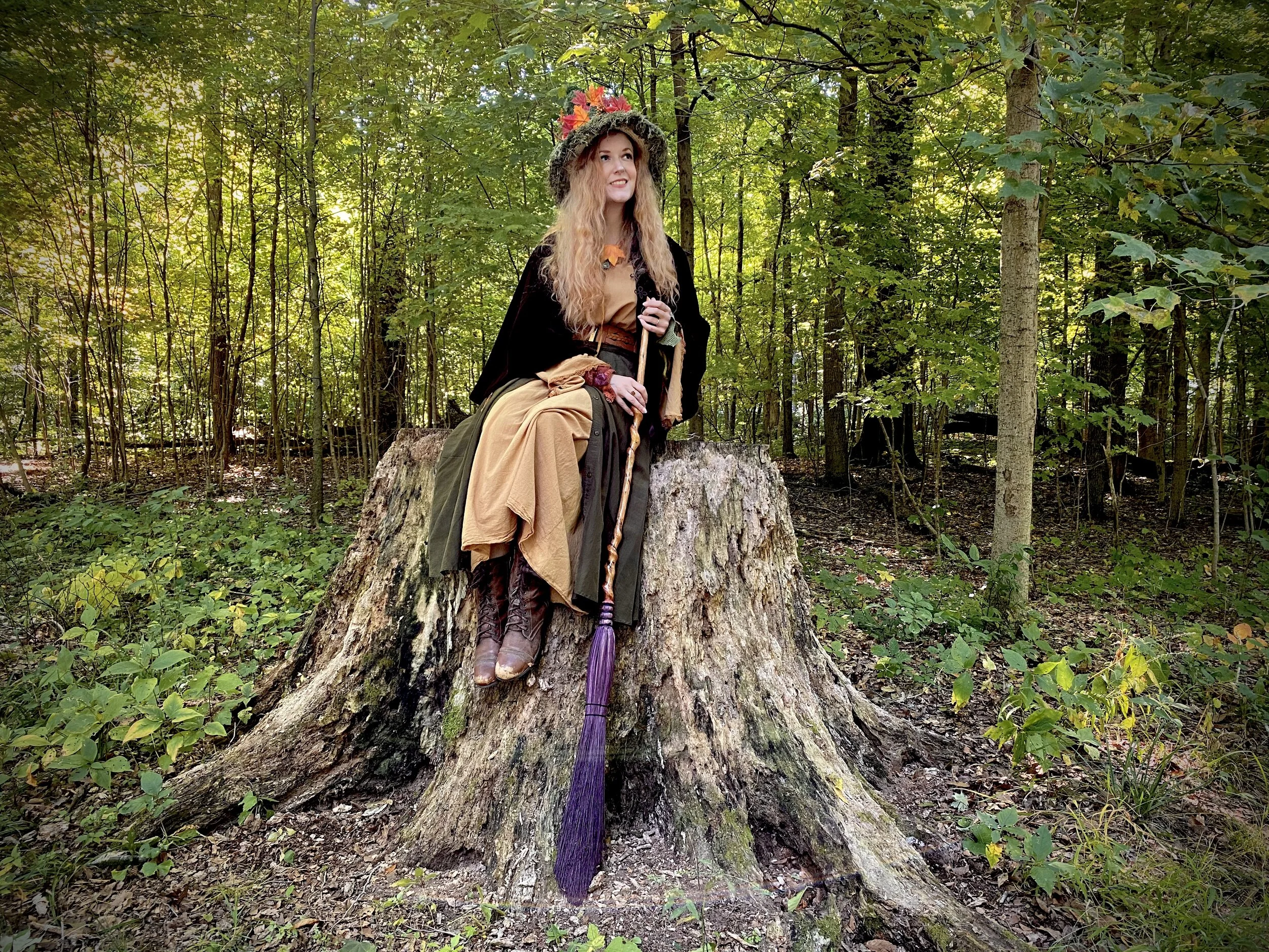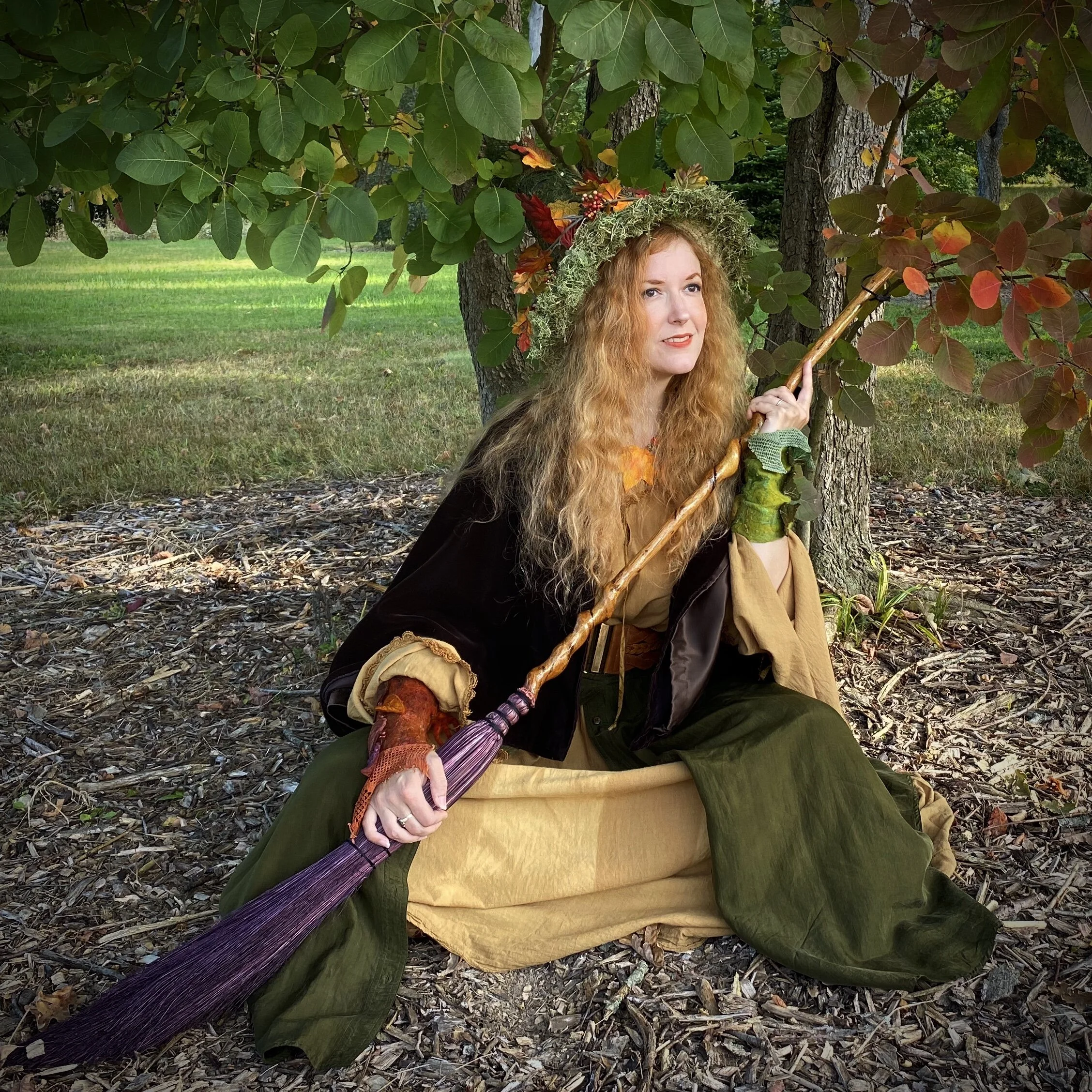 She was the witch of the woods with garments that shifted and transformed with the seasons. As summer’s green gradually changed to reds and golds, so too did her cape, her underdress. Autumn leaves sprouted on her moss-covered witch hat. She walked her forests and touched the green leaves with her besom handle, whispering to them that it was time to exchange their emerald for amber.